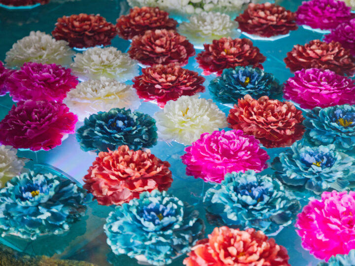「浮花 -Fuka-」は、自然石や松が織りなす日本庭園の景観に、色とりどりの花のオブジェを組み合わせた体験型コンテンツ。池の水面に浮かぶ花々と円形のステップにより、来場者自身が風景の中に入り込むような感覚を味わえる構成となっている。