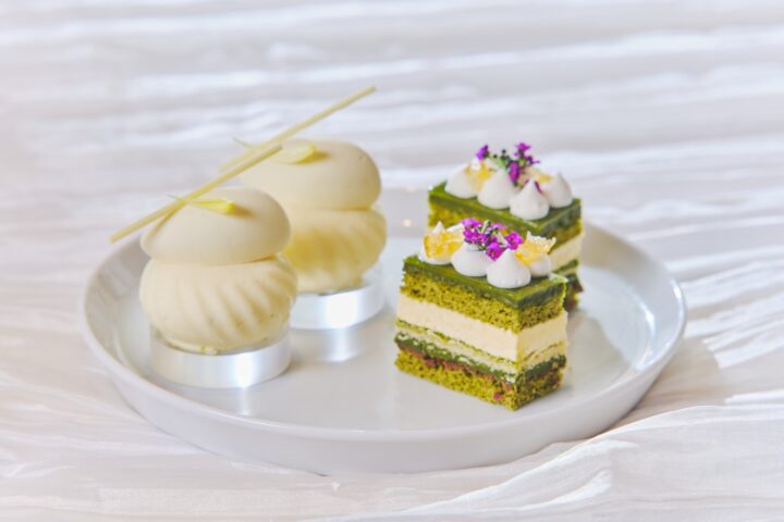 スイーツは、いちごと抹茶のヴェリーヌ、いちごと抹茶のタルト、いちごのムース、抹茶のマカロン、抹茶とレモンのオペラ、抹茶のジュレとホワイトチョコライムのムースの6種を用意。いちごの華やかな酸味と、抹茶の濃厚な香りが重なり合う構成となっている。