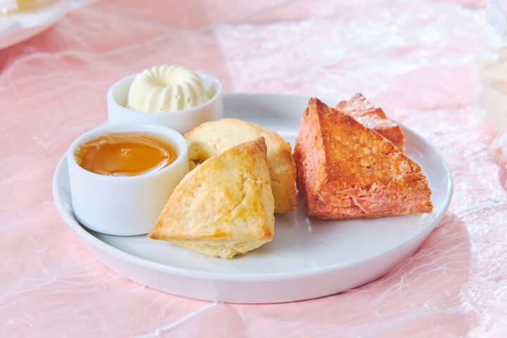 さらに、スコーンはミルクといちごの2種を用意。クロテッドクリームとはちみつを添えて味わえる。オプションでは、抹茶のジュレや宇治抹茶アイス、三色団子を重ねた「いちごと抹茶のミルフィーユパフェ」や、スペシャルドリンク「シトラススプリング」も追加可能だ。
