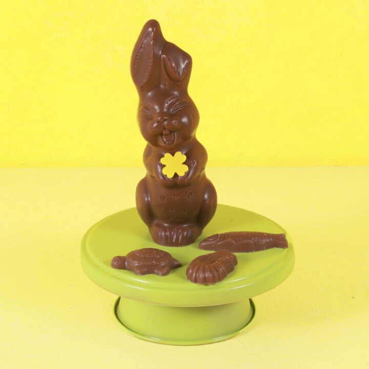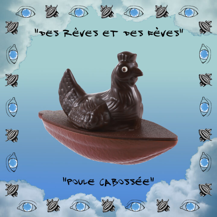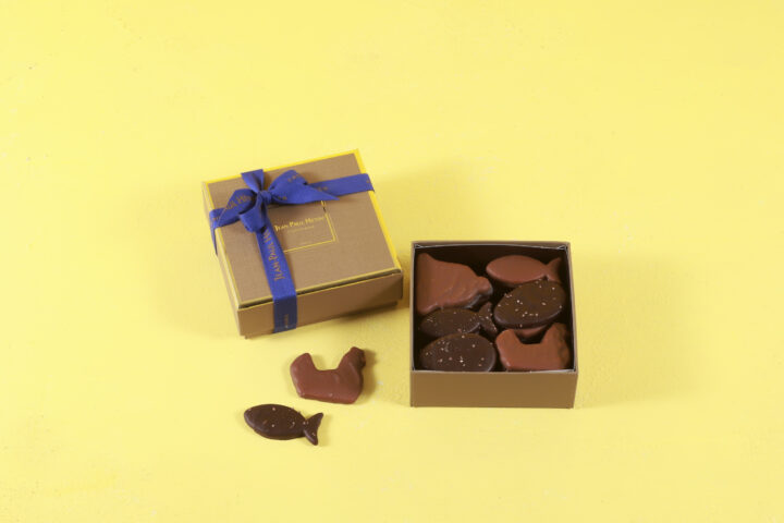 代表的な商品には、日付が刻まれたユーモラスな卵型ショコラ「ウフ デュ ジュール」や、カカオの実から現れためんどりを表現した「プール カボセ」、チョコレートで作られたウサギの「ラパン」などが登場。いずれも中には魚や海の生き物をかたどったショコラ「フリチュール」が入っている。