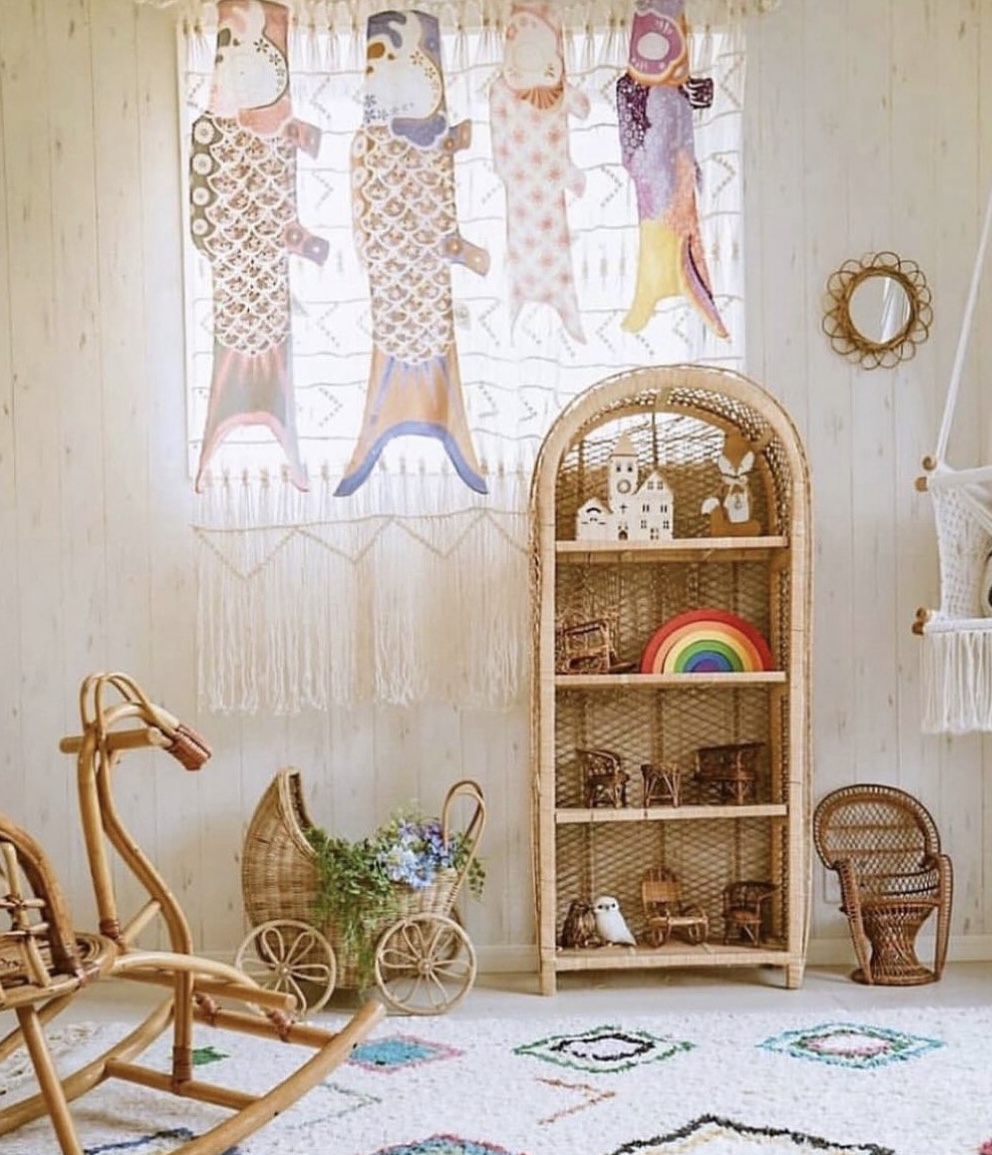 素材は100%オーガニックコットン製で、洗濯機での洗濯も可能。サイズは45cm・70cm・100cm・140cmの4種類を用意し、特に70cmサイズが人気。竿に取り付けるほか、壁に貼る、カーテンレールに吊るすなど自由な飾り方が楽しめる。