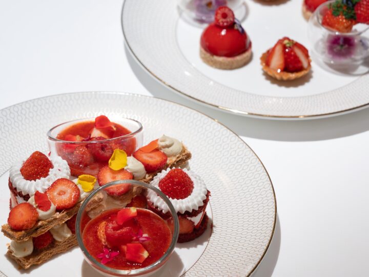 スイーツには、旬のあまおうを贅沢に使用した苺のヴェルヴェットケーキやミルフィーユ、タルト、ブランマンジェなど全6種をラインナップ。甘みと酸味のバランスに優れた苺の魅力を存分に味わえる構成となっている。