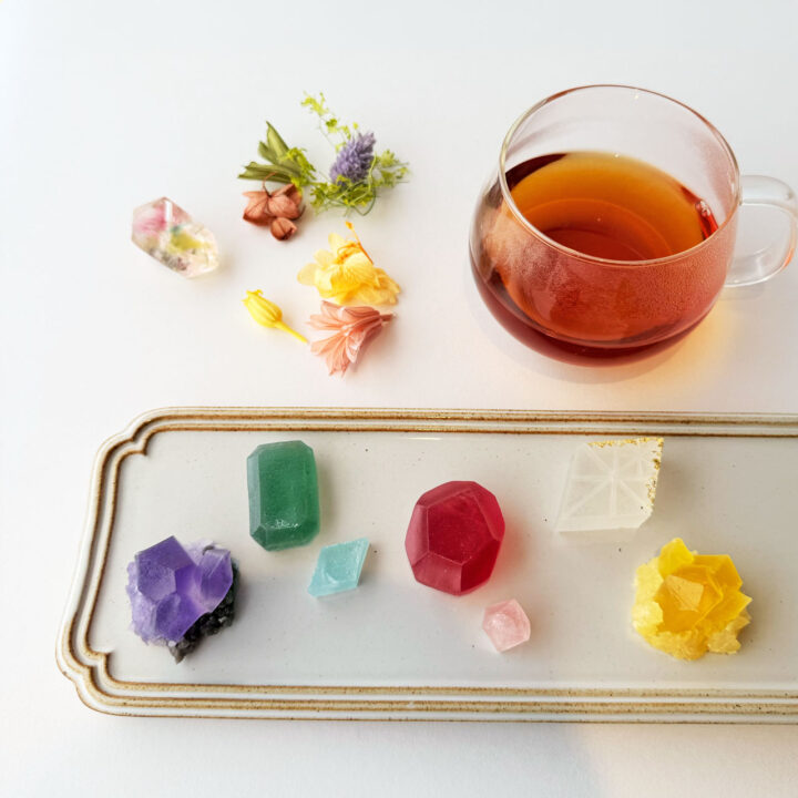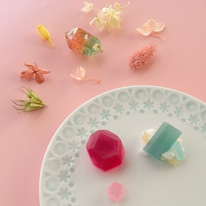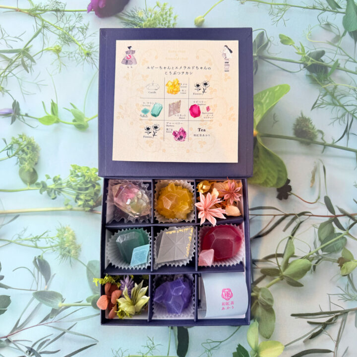 ラインナップは、琥珀糖を詰め合わせた「こうぶつヲカシ」4粒・9粒セットと、アイスケーキ「宝石のカッサータ」。いずれも宝石や花を思わせる繊細なデザインで、箱を開けた瞬間に広がる世界観が特徴となる。