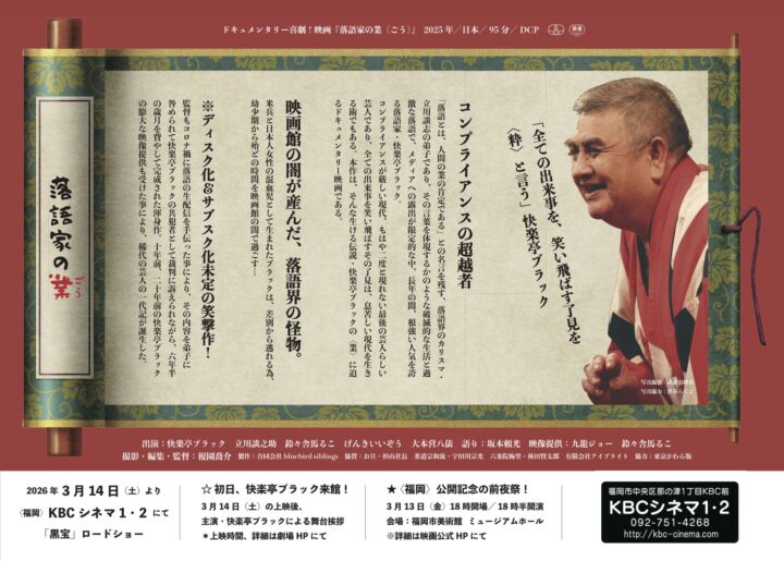 東京・大阪・名古屋で大きな話題を呼んだドキュメンタリー映画「落語家の業(ごう)」が、いよいよ福岡で公開される。主演は“コンプライアンスの超越者”とも称される落語家・快楽亭ブラック。ディスク化やサブスク配信は未定という本作が、2026年3月14日よりKBCシネマで上映される。