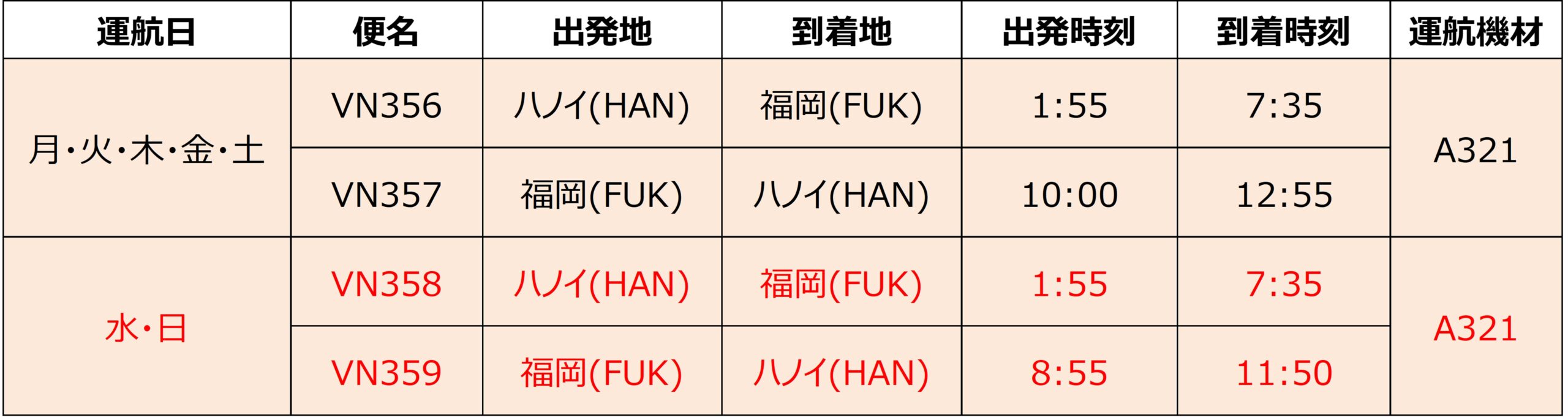 路線:福岡-ハノイ線(週5便から毎日運航へ)