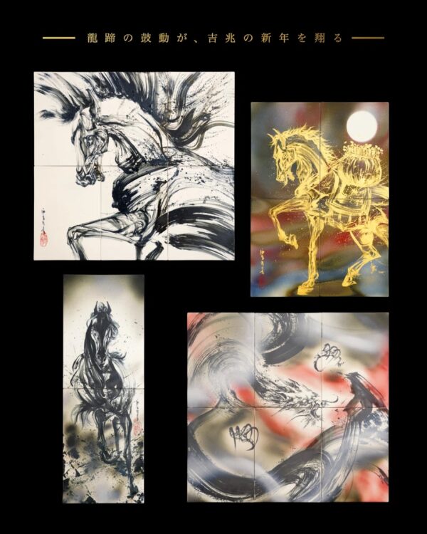 午は古来より、勢いよく駆ける姿から「前進」「飛躍」「成功」を象徴する縁起物として親しまれてきた。本展では、その象徴性を新春の始まりと重ね合わせ、未来へと向かう推進力や生命の躍動を作品群に託している。
