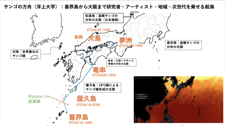 航路は喜界島から屋久島、高知・土佐清水、岡山・犬島を経て大阪・天保山港へ至るもので、黒潮とサンゴの命の旅を象徴したルート構成となる。各寄港地では乗船体験イベントや音楽交流、サンゴ礁調査などを実施。喜界島では出航前に地域住民向けの乗船体験と音楽ライブも予定されている。