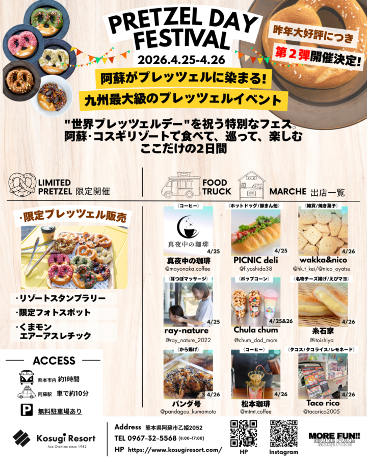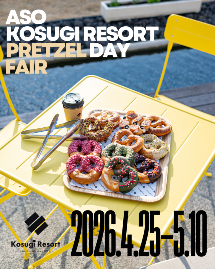 熊本・阿蘇のKosugi Resortにて、九州最大級のプレッツェルイベント「PRETZEL DAY FESTIVAL(プレッツェルデイ フェスティバル)」が2026年4月25日・26日の2日間開催される。さらに5月10日までの期間、「PRETZEL DAY FAIR」も実施され、ゴールデンウィークを通して楽しめる企画となっている。