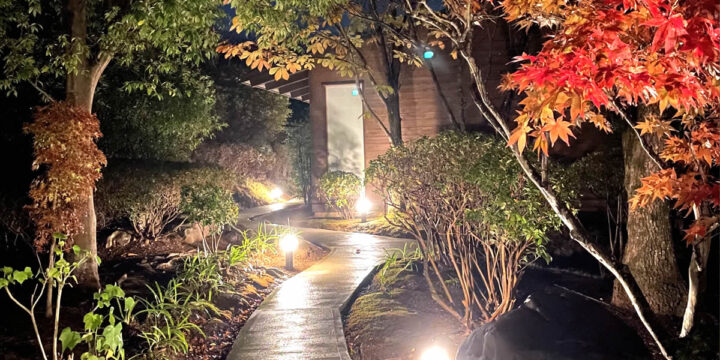 客室は全18室。約2000坪の庭園は夜間ライトアップされ、非日常感あふれる滞在を演出する。