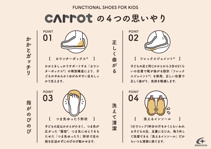 さらに、Carrotの特徴である“子どもの足の特徴に合わせた4つの思いやり設計”を搭載。成長段階にある足をやさしくサポートする構造となっている。