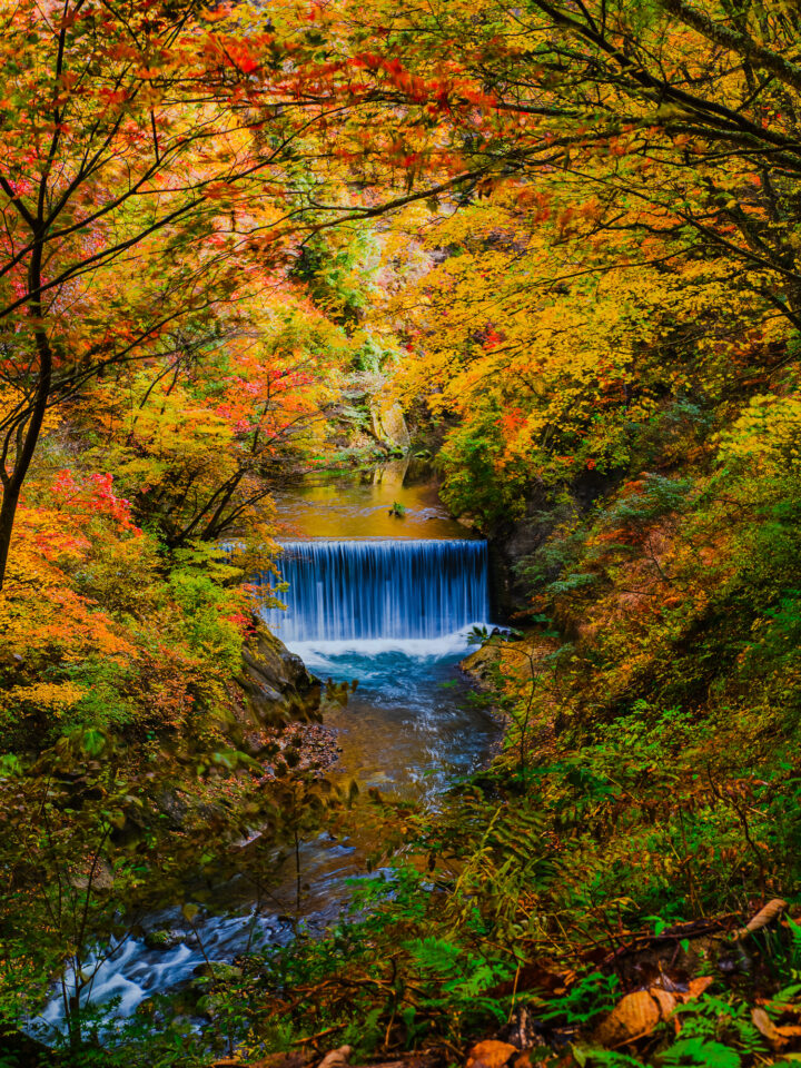 ボートで渓谷を進めば、頭上から滝のしぶきと紅葉が舞い降り、まるで神話の世界に入り込んだかのよう。