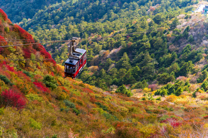 普賢岳ロープウェイに乗れば、眼下に広がる紅葉の絨毯が一望できる。