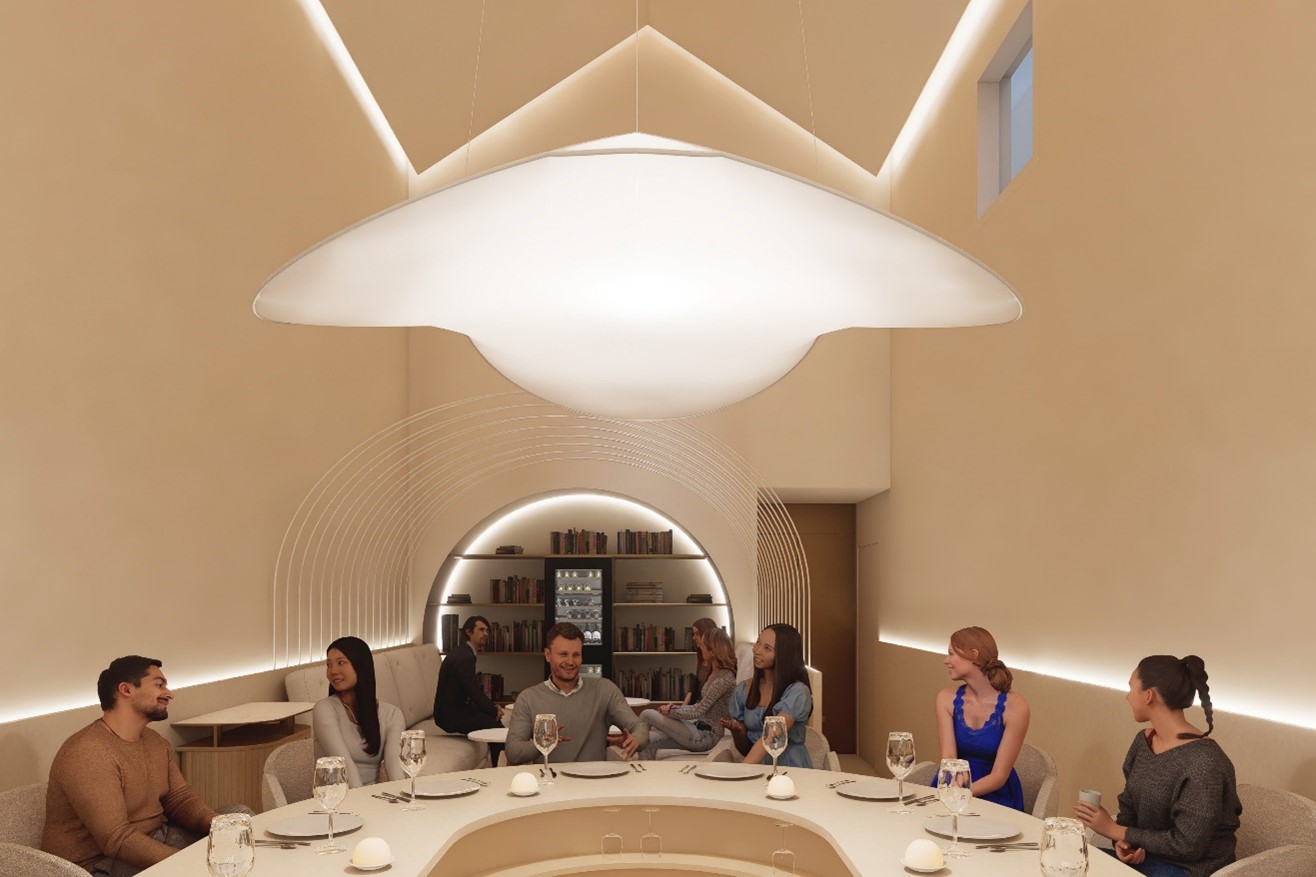 空間デザインは、スイスを拠点に世界的に活動するデザインチーム「atelier oï(アトリエ・オイ)」が担当。チャペル跡地の天井高を活かした白基調のカウンター8席は、光と静けさが共存する場として設計され、料理と調和した体験を創出する。彼らにとって九州初のプロジェクトであり、初のレストランデザインでもある。
