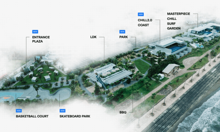 NOT A HOTEL AOSHIMA(宮崎県宮崎市青島)がスポーツエリアやパークエリアなどのパブリックスペースを拡張し、さらに魅力的なビーチタウンへとアップデートされる。新たに誕生する「CHILL2.0」と「COAST」の販売が2024年10月29日より開始され、開業は2026年夏を予定している。