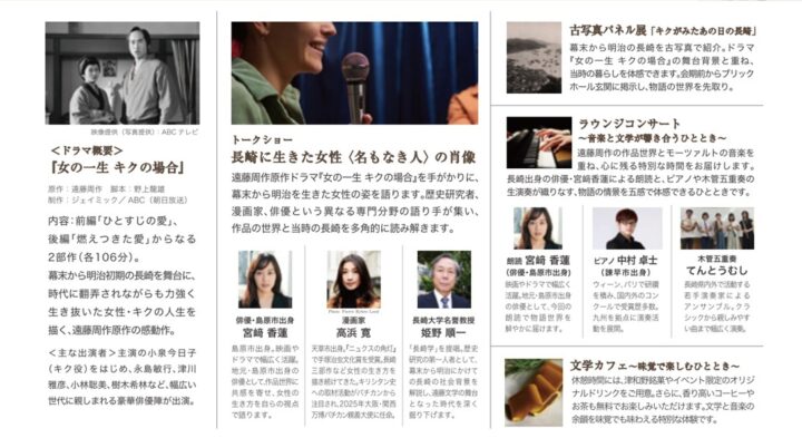 当日は、遠藤周作原作のテレビドラマ『女の一生 キクの場合』の上映に加え、長崎出身の俳優・宮崎香蓮氏、漫画家・高浜寛氏、長崎大学名誉教授・姫野順一氏によるトークショーを実施する。さらに、ピアノと木管五重奏によるラウンジコンサートや、文学をテーマにしたオリジナルドリンクや津和野銘菓の提供、古写真展示「キクが見たあの日の長崎」なども企画されている。