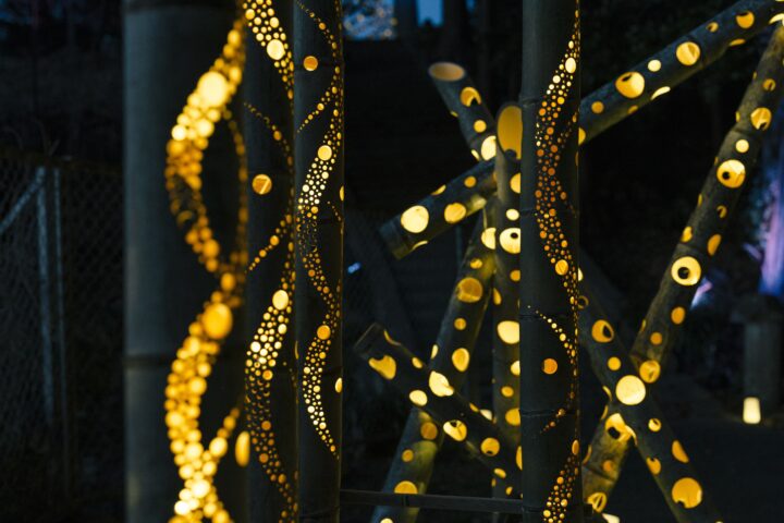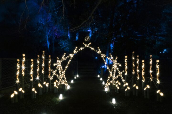 旧小浜神社と現小浜神社、そして商店街を結ぶ「光の道」では、竹灯籠が参道をやさしく照らす。地域の記憶が宿る場所を光でつなぎ、小浜の歴史を感じながら歩く体験を創出する。