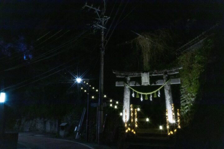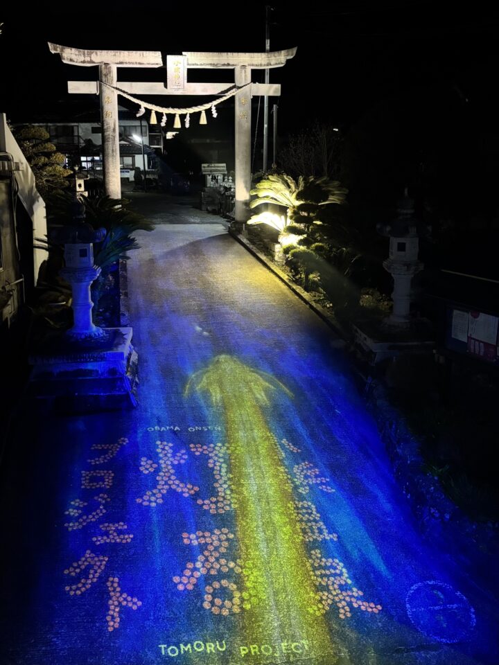 現小浜神社では、歴史ある社殿を舞台にプロジェクションマッピングを実施。静寂な夜の神社にデジタルアートが重なり、幻想的な光景を描き出す。