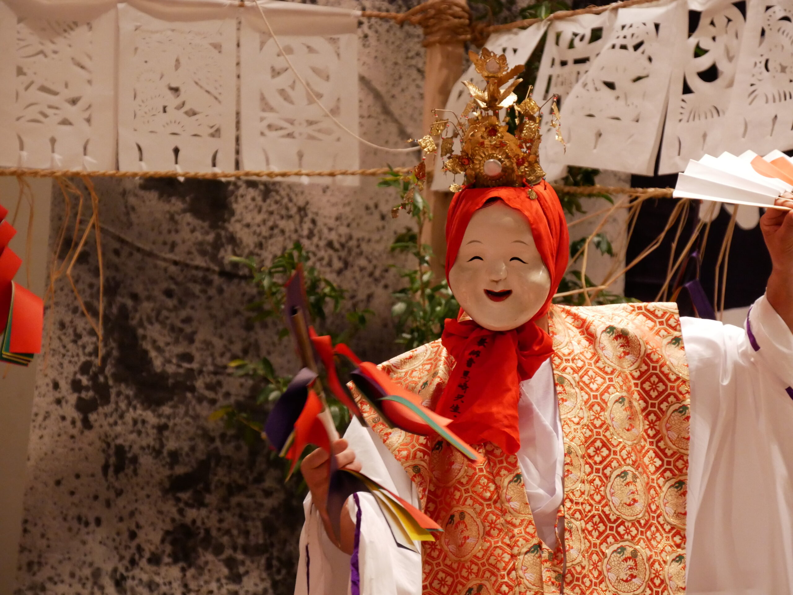 神話エリア: 神楽のVR体験、衣装試着、神話の世界観を表現した装飾。