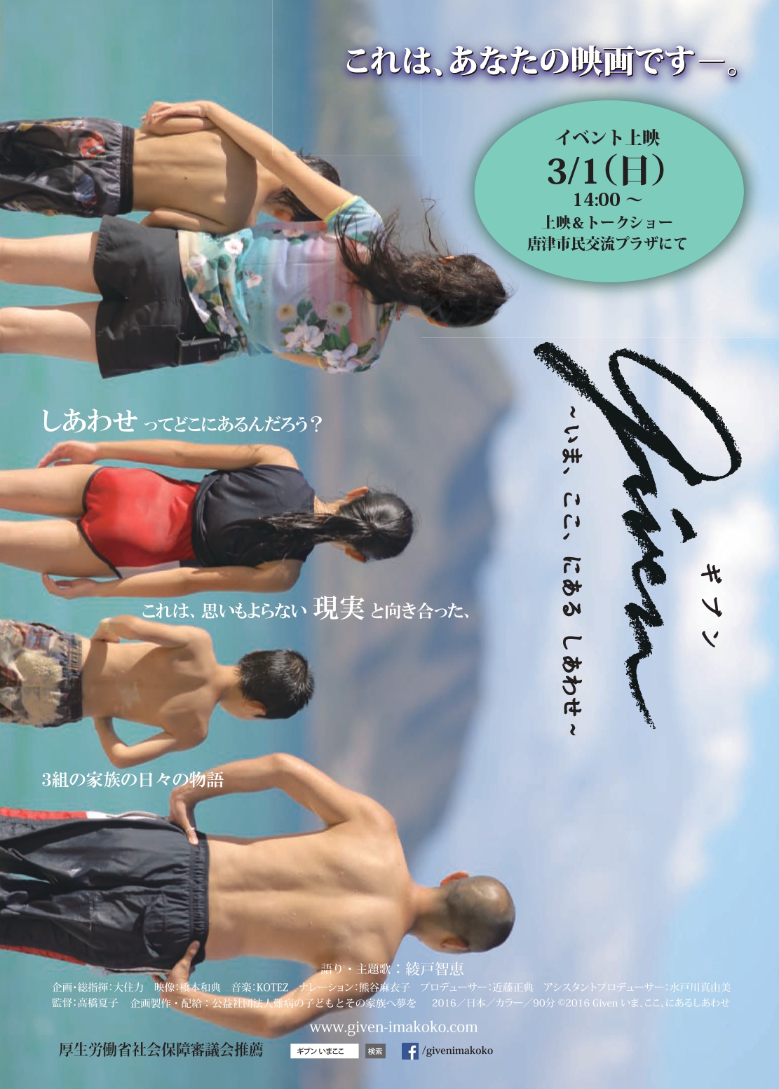 佐賀|ドキュメンタリー映画『Given ~いま、ここ、にあるしあわせ~』唐津上映会 3月1日開催