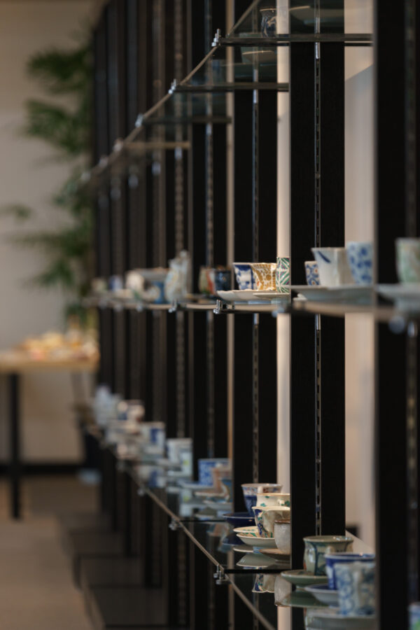 各窯元提供のカップから自由に選べるセルフスタイルのカフェを併設。お買い物や商談の合間にくつろげる空間として利用できる。