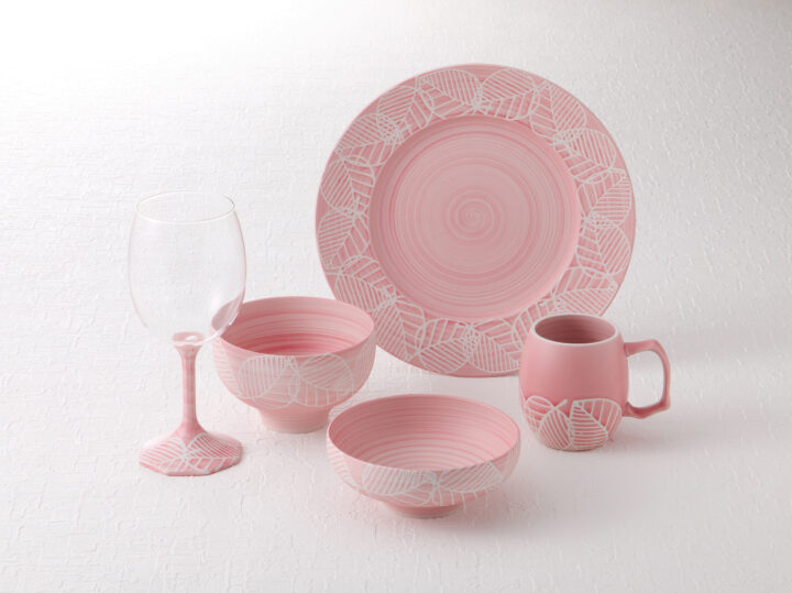デザインは「麻乃葉模様」「若葉模様」「手描墨絵唐草模様」の3種。洋皿、ボウル、平ボウル、カジュアルワイングラス、マグカップの5アイテム展開(全15種)。高度な再資源化技術を用いながら、従来の有田焼とほぼ同等価格を実現した。